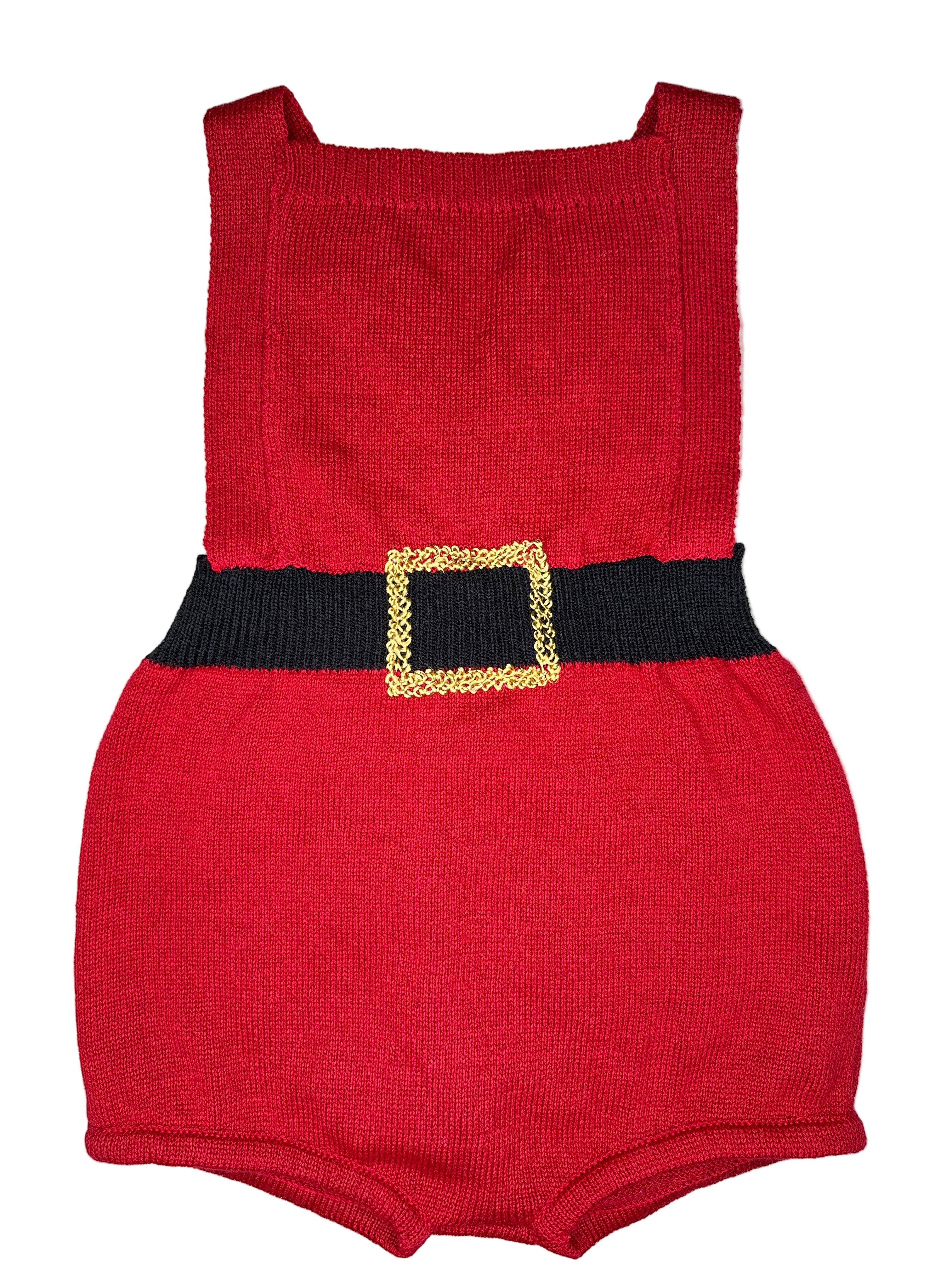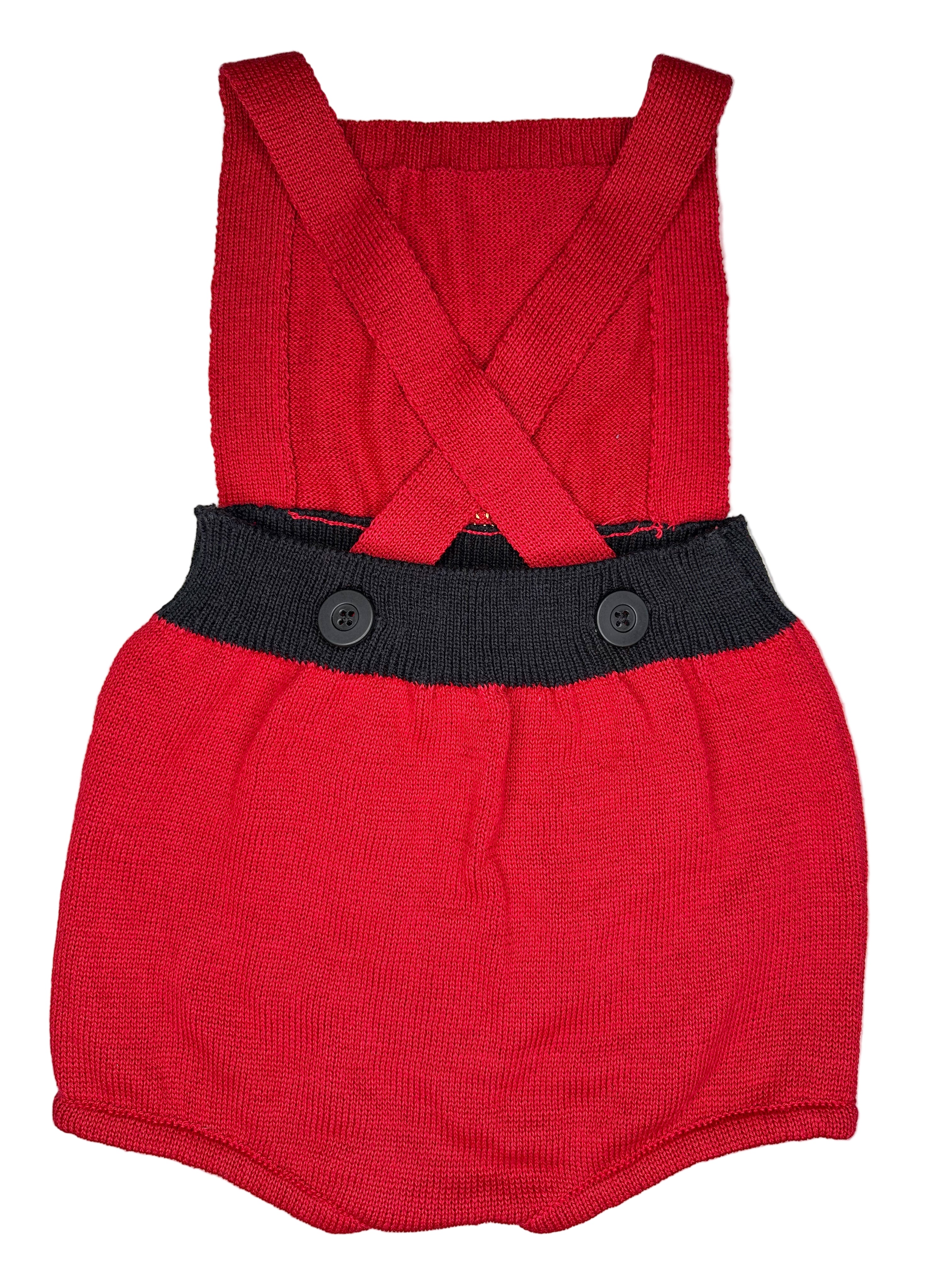 Romper confeccionada em tricô antialérgico, de toque macio e confortável. Cor única: vermelha com detalhes em preto e bordado manual dourado. Possui regulagem altura por botões na alça.